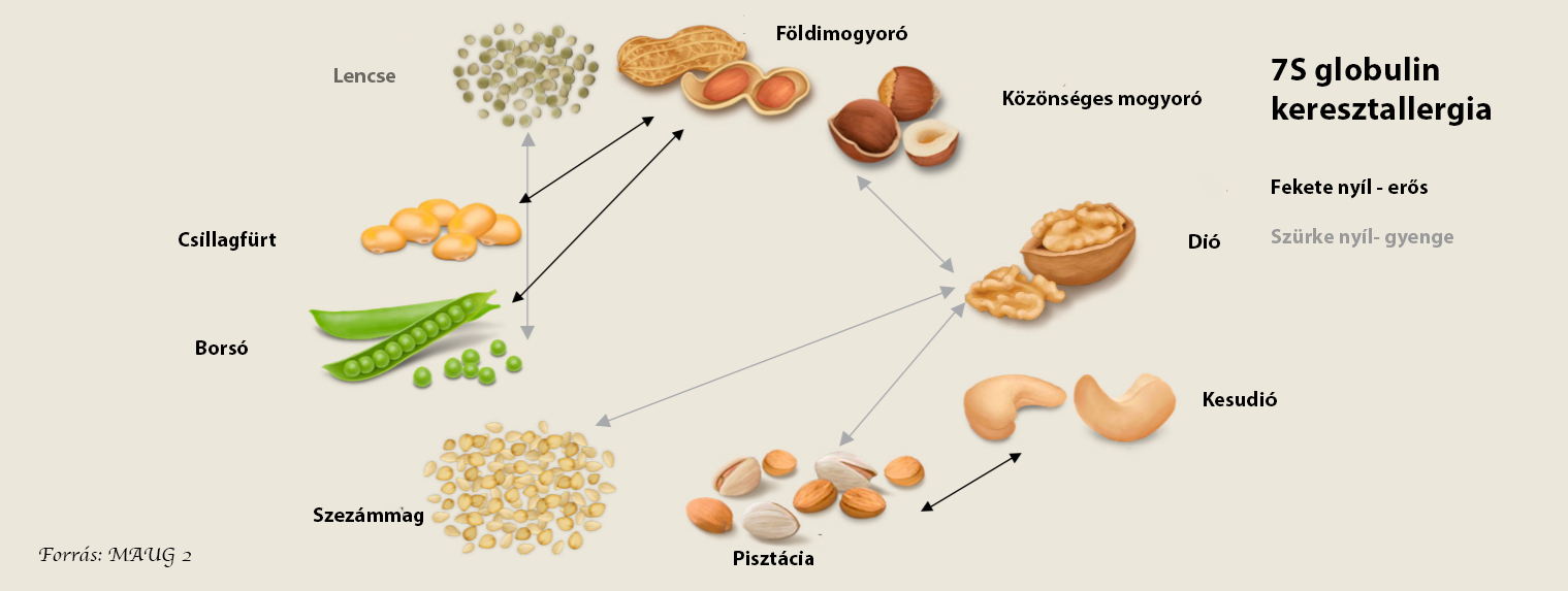 A különböző növénytani osztályokba tartozó magok közötti keresztallergia nagyon változatos képet mutat. Mivel a földimogyoró a hüvelyesek családjába tartozik, ezért klinikailag jelentős keresztallergia a diófélékkel szemben ritkábban ( mint várnánk) alakul ki, így a földimogyoró allergiásoknak csak a bizonyított, és klinikai tüneteket kiváltó dió, közönséges mogyoró, szezám stb. magokkal szemben kell elkerülő diétát tartani.
